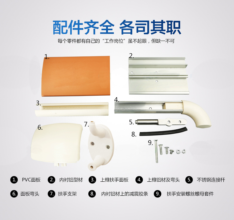 2、扶手標(biāo)準(zhǔn)配置為每米配PVC上下面板各1米,上下緣鋁材各1米,每米配置上下彎頭各1個,0.6米配置上墻支架1個;